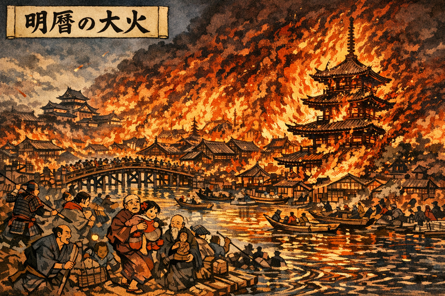 ■明暦の大火(1657年)・・・上記振袖火事の日と同じく江戸の市街地の約6割を焼失した大火事が起こったことに由来します。その後の江戸の都市計画(火除地・広小路整備など)に大きな影響を及ぼしました。