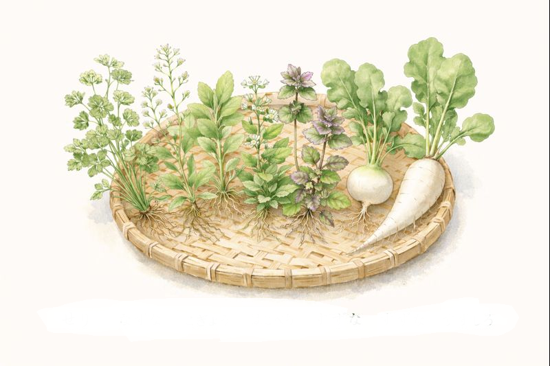 人日(じんじつ)の節句/七草の節句・・・人日の節句とは、五節句の一つで、1月7日に行われます。この日に七草粥(ななくさがゆ)を食べ、無病息災を願う風習があります。正月のごちそうで疲れた胃腸を休める、という実用的な意味合いもあります。七草とはせり、なずな、ごぎょう、はこべら、ほとけのざ、すずな(蕪)、すずしろ(大根)の七種の野草や野菜です。