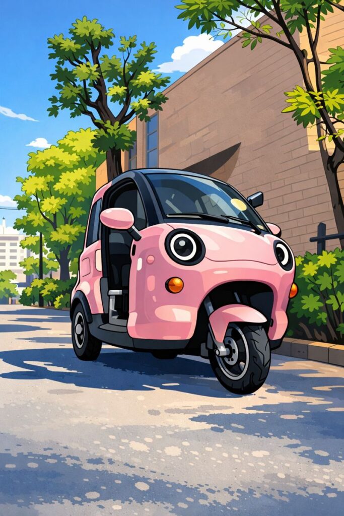 このイラストはEVジェネシス株式会社さんがネット上に公開していた写真をAIでイラスト化したものです。フロント部分が顔のように見えて可愛らしいですね。EVジェネシス株式会社の三輪EV「スリールオータ」の価格は、 一般報道によれば、新車価格は約98万円前後と紹介されています。